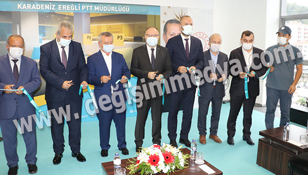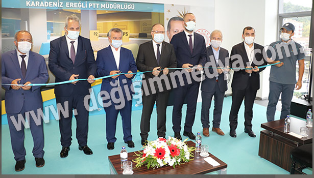 Ereğli PTT Müdürlüğü’nün yeni konsept binası, törene katılan protokol tarafından açılış kurdelesi kesilmek suretiyle hizmete girdi. Vali Mustafa Tutulmaz, kurdeleyi keserken, “Bu eser, tüm Ereğli için, hayırlı uğurlu olsun” ifadelerini kullandı.