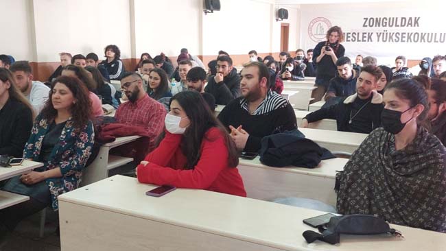 ZMYO Kilimli Kampüsü’nde, Görsel İşitsel Medya Okuryazarlığı bölümü öğrencilerine, Zonguldak Gazeteciler Cemiyeti Başkanı Derya Akbıyık ve İz Medya Prodüksiyon Yöneticisi Yeşim Çakır “Habercilik ve Meslek Etiği” isimli seminer verdi. Seminer de gazetecilik alanı ile ilgili konuşma yapan Akbıyık, mesleğin avantajlı ve dezavantajlı yönleri hakkında öğrencileri bilgilendirerek, gazetecilik mesleğinin önemine değindi.