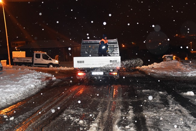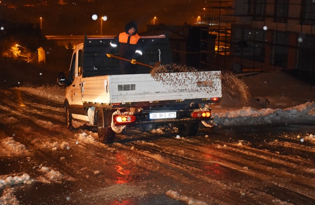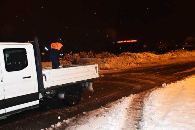 Belediye Fen İşleri Müdürlüğü’ne bağlı ekipler, bir yandan yol açma çalışmalarına devam ederken hastane yolu rampası başta olmak üzere araçların zorluk yaşayabileceği rampalı yollarda tuzlama çalışması yapıyor.
