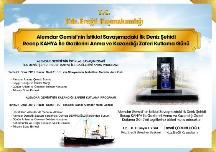 İstiklal Savaşı'nın ilk deniz şehidi Recep Kahya'yı anma programının Süleymanlar Mahallesi'ndeki Alemdar Anıtı önünde 27 Ocak Pazar günü saat 11.00'de, Alemdar Gemisi'nin ilçeye gelişinin kutlama programının ise aynı gün saat 11.30'da Alemdar Müze Gemisi'nde gerçekleştirileceği duyuruldu.