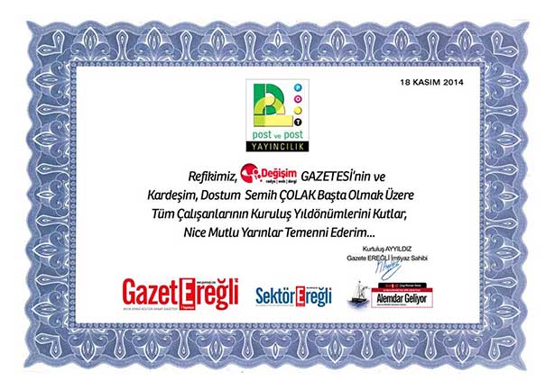 Karadeniz Ereğli gündemine damgasını vuran karikatürist meslektaşımız Kurtuluş Ayyıldız'ın Değişim Gazetesi için hazırladığı kutlama beratını aynen yayınlıyoruz: