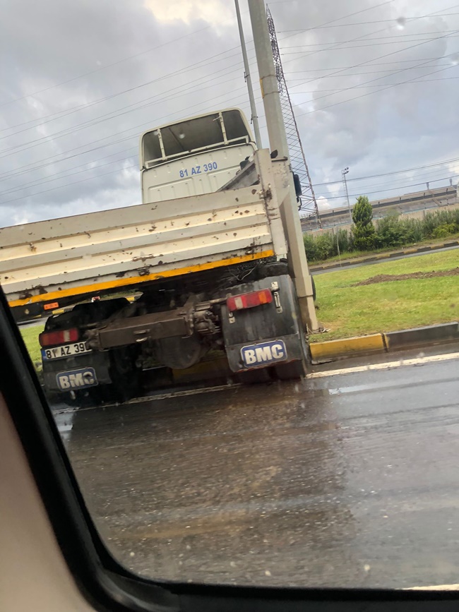 İddiaya göre, yağan yağmurdan dolayı kayganlaşan yolda direksiyon hakimiyetini kaybeden TIR refüje çıkarak durabildi. Şans eseri kazada yaralanan olmazken TIR ufak çaplı hasar meydana geldi. TIR olay yerinden kaldırılırken, polisin kazayla ilgili soruşturma başlattığı öğrenildi.