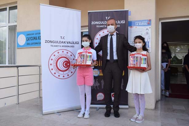Zonguldak İl Ticaret Müdürü İsmail Maden, Çaycuma İlçe Milli Eğitim Müdürü İsmail Baş ve Çaycuma Ticaret ve Sanayi Odası Yönetim Kurulu Başkanı Zekai Kamitoğlu öğrencilere katılım belgelerini, çerçevelenmiş yarışma katılım resimlerini ve boya takımlarını hediye etti. Zonguldak İl Birincisi Çaycuma Koleji Özel Çaycuma Ortaokulu 8.sınıf öğrencisi Arya Sert’e Çaycuma TSO Yönetim Kurulu Başkanı Zekai Kamitoğlu tarafından akıllı saat hediye edildi. İlçe Milli Eğitim Müdürü İsmail Baş “ Zonguldak İl Birincisi Arya Sert ve yarışmaya katılım sağlayan Bürde Bostancı, Dila Özcan, Eylül Tuba Başoğlu, Tuana Cura ve Şevval Gedik’i ve onları yetiştiren öğretmenlerimizi tebrik eder, başarılarının devamını dileriz ” dedi.