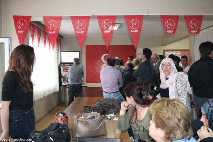 Parti hizmet binalarında bekleyen partililer, adeta nefes almadan, oluşturulan dev ekrana yansıtılan sonuçları takip ediyor.