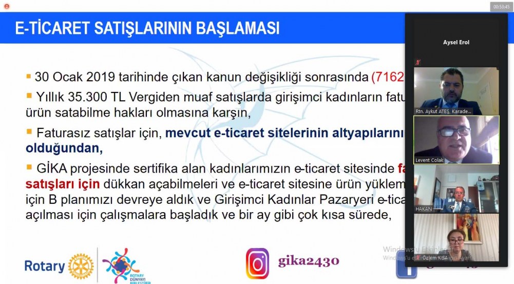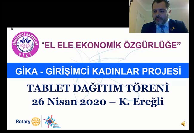 Bu dönem Mart ayı sonunda yapılması plananlanan Girişimci kadınlara eğitimleri sonrası takdim edilecek tabletlerin dağıtım töreni, yaşanılan bu sıkıntılı günler nedeniyle online olarak Pazar günü gerçekleştirildi. Zoom üzerinden gerçekleştirilen ve bölgenin ilk online GİKA Toplantısı olma özelliği taşıyan törene 70e yakın kişi katıldı. UR 2430. Bölge Guvernörü Hakan Karaalioğlu, Geçmiş Dönem Guvernörü Altan Arslan, 28.Grup Kul. Sorumlu Guvernör Yard. Muhittin Dikmen, GİKA Komitesi Başkanı Levent Çolak, Geçmiş Dönem Guv.Yrd. Aydoğan Tekin, Geçmiş Dönem Başkanları, Kulüp üyeleri, basın mensupları Doğan Gönüllü ve Fikri Kapan ile birlikte projenin neferleri girişimci kadınlar toplantıya online olarak evlerinden katıldı. Törenin açılışında saygı duruşu ve İstiklal Marşı okunurken ardından katılımcılara proje süreci ve tabletlerin dağıtımı ile ilgili bilgiler verildi.