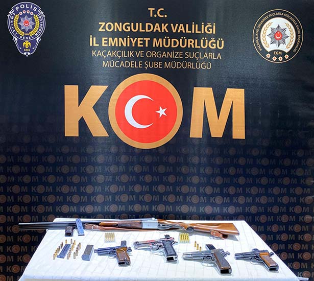 Zonguldak Emniyet Müdürlüğü Kaçakçılık ve Organize Suçlarla Mücadele Şube Müdürlüğü ekipleri ruhsatsız silah ticareti yaptığı iddia edilen şüphelilere yönelik düzenlediği operasyonda ruhsatsız silah ele geçirdi. Operasyonda 9 şüpheli gözaltına alındı.