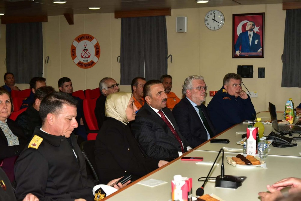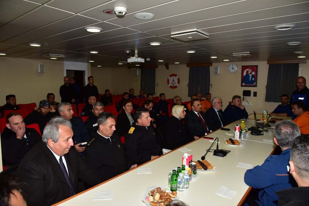 "Valimiz Osman Hacıbektaşoğlu ve Cumhurbaşkanı Başdanışmanı Saadet Oruç, kayıp denizcilerimizin arama kurtarma faaliyetlerini sürdüren “NENE HATUN” gemisinde; Kıyı Emniyet, Kdz. Ereğli Bölge Komutanlığı, Sahil Güvenlik Komutanlığı, İl Emniyet Müdürlüğü, İl Jandarma Komutanlığı ve AFAD tarafından hazırlanan ortak sunum ile yürütülen çalışmalar hakkında bilgi aldılar."