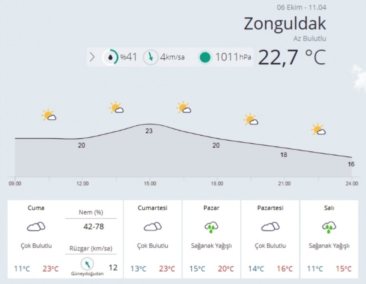 Meteoroloji Genel Müdürlüğü'nden alınan verilere göre Zonguldak'ta il genelinde Cuma (bugün) ve Cunartesi günü hava durumunun çok bulutlu olması bekleniyor. Hava cıvaklıkalrında ani düşüşün yaşanacağı haftada sıcaklıkların 23 dereceden 15 dereceye adar düşeceği tahmin ediliyor.