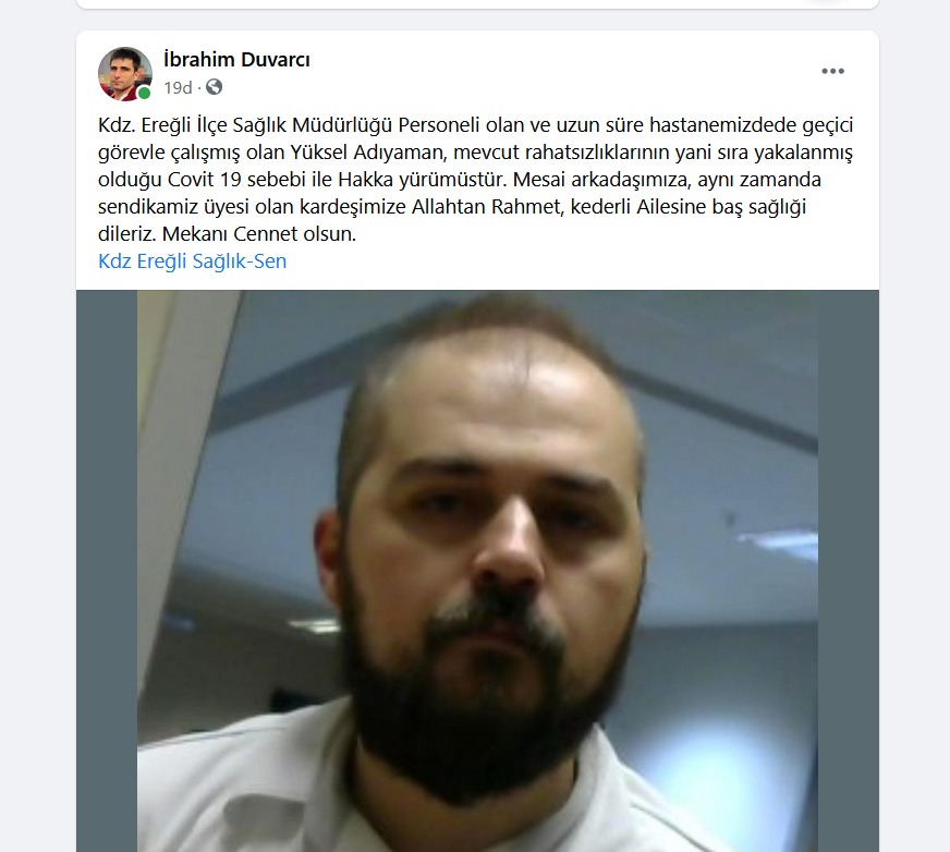 Sağlık Sen Ereğli Şube Başkanı İbrahim Duvarcı sosyal medya hesabından yaptığı paylaşımında “Ereğli İlçe Sağlık Müdürlüğü Personeli olan ve uzun süre hastanemizde de geçici görevle çalışmış olan Yüksel Adıyaman, mevcut rahatsızlıklarının yani sıra yakalanmış olduğu Covit 19 sebebi ile Hakka yürümüştür. Mesai arkadaşımıza, aynı zamanda sendikamız üyesi olan kardeşimize Allahtan Rahmet, kederli Ailesine baş sağlığı dileriz. Mekânı Cennet olsun”
