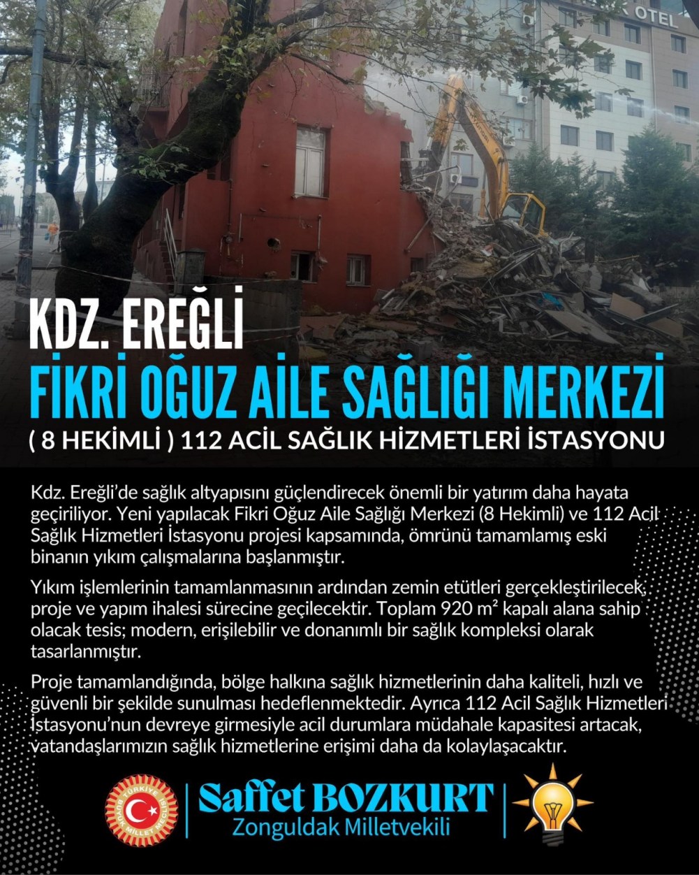 Konu ile ilgili olarak açıklamada bulunan AK Parti Zonguldak Milletvekili Saffet Bozkurt “ Kdz. Ereğli’de sağlık altyapısını güçlendirecek önemli bir yatırım daha hayata geçiriliyor. Yeni yapılacak Fikri Oğuz Aile Sağlığı Merkezi (8 Hekimli) ve 12 Acil Sağlık Hizmetleri istasyonu projesi kapsamında, ömrünü tamamlamış eski binanın yıkım çalışmalarına başlanmıştır. Yıkım işlemlerinin tamamlanmasının ardından zemin etütleri gerçekleştirilecek proje ve yapım ihalesi sürecine geçilecektir. Toplam 920m2 kapalı alana sahip olacak tesis; erişilebilir ve donanımlı bir sağlık kompleksi olarak tasarlanmıştır.
