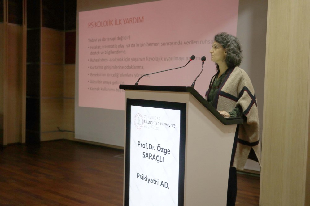 Zonguldak Bülent Ecevit Üniversitesi Hastanesi, kurum içerisinde görev yapan sağlık çalışanlarına "psikolojik yönden depremzedelere yaklaşım" eğitimlerini sürdürüyor. Yıkıcı etkiye neden olan depremden etkilenen vatandaşların normal hayatlarına dönebilmesi için bir süreçten geçtiğine dikkat çeken Prof. Dr. Özge Saraçlı; sağlık çalışanlarının da doktor, hemşire ve personel olmanın yanında hasta yakını rollerini de telafi etmesi gerekebildiğinin altını çizdi.