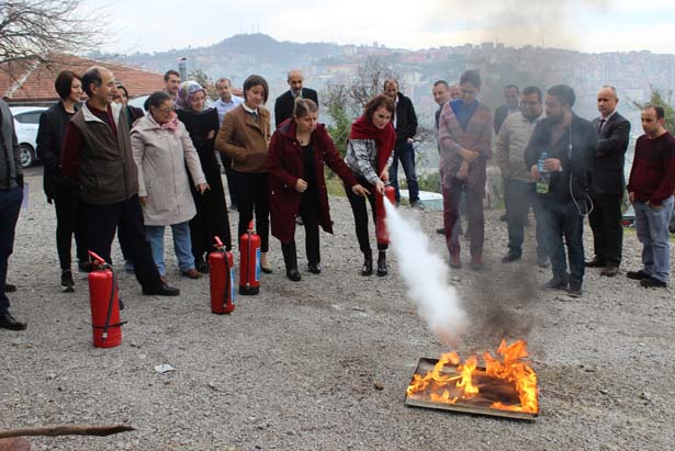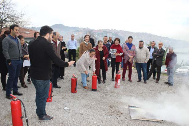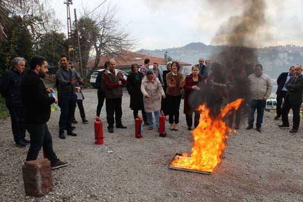 Müdürlük bahçesinde düzenlenen yangın tatbikatında Müdürlük Sivil Savunma Uzmanı Aysel Baysal tarafından yangın söndürmede kullanılan malzemeler hakkında bilgiler verilmiş olup, deney kazanı içinde ateş yakılarak çalışanlara yangın söndürme cihazları ile ateşin söndürülmesi işlemi yaptırılmıştır. Bu nedenle herhangi bir yangın başlangıcında cihazların piminin çekilerek tereddüt etmeden yangına müdahale etmenin önemi anlatıldı.