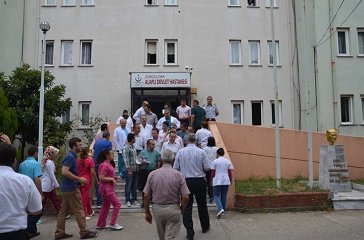 Alaplı Devlet Hastanesi önünde bir araya gelen Alaplı Sağlık-Sen Temsilcisi Kenan Ateş ve Alaplı TopluSsağlık Temsilcisi Deniz Karakuş ile üyeler, ülkede yaşanan terör olaylarına tepki gösterdi.