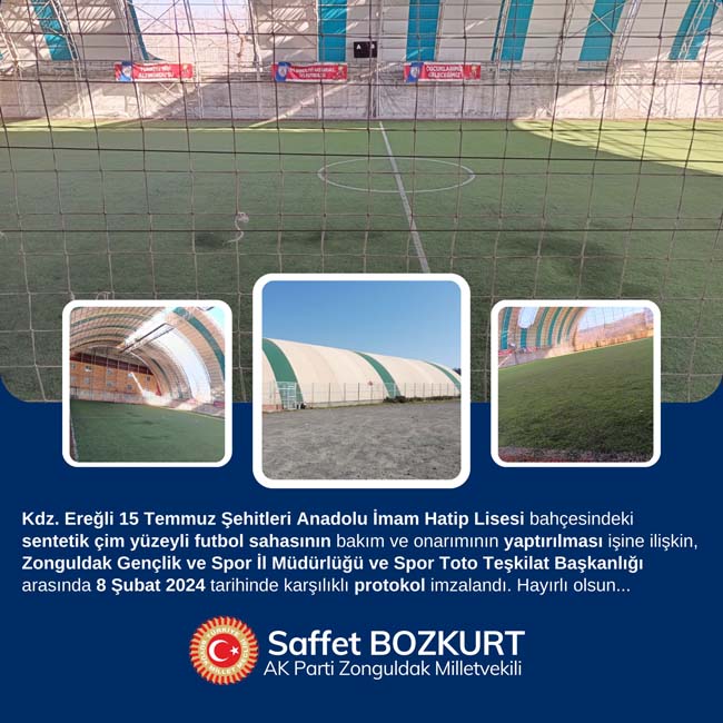 AK Parti Zonguldak Milletvekili Saffet Bozkurt; Kdz.Ereğli 15 Temmuz Şehitleri Anadolu İmam Hatip Lisesi bahçesine sentetik çim yüzeyli futbol sahasının bakım ve onarımının yapılacağını duyurdu.