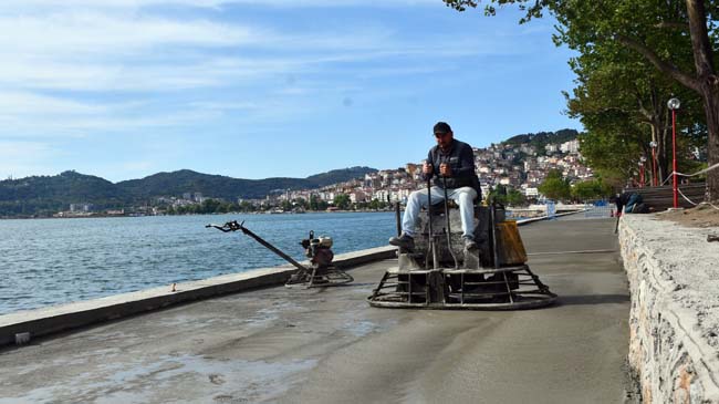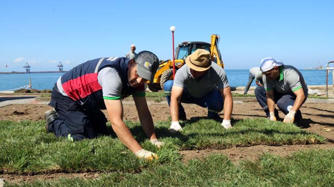 Sahilde yıkılan yerlerde onarım çalışmaları tamamlanırken yeşillendirme ve çimlendirme işlemleri son aşamaya geldi.