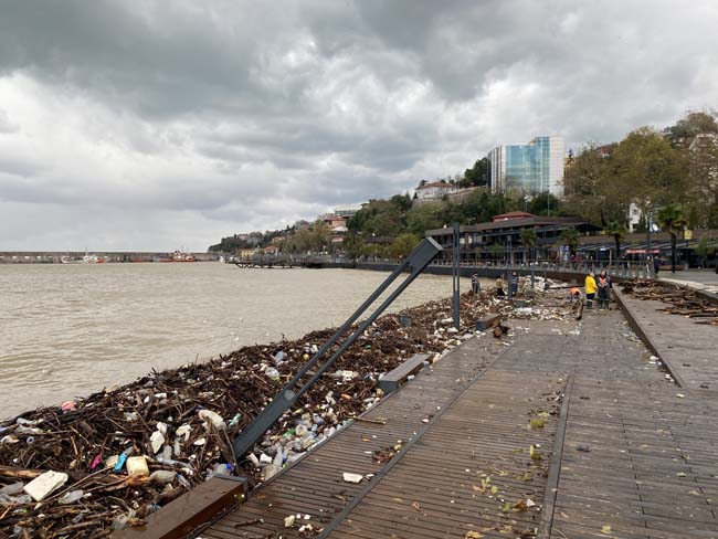 Dün akşam saatlerinde etkili olan sağanak yağış ve fırtına kent merkezini de vurdu. Yağışlarla birlikte derelerden sürüklenen çok sayıda odun paçası ve plastik atıklar sahil kenarına vurdu.