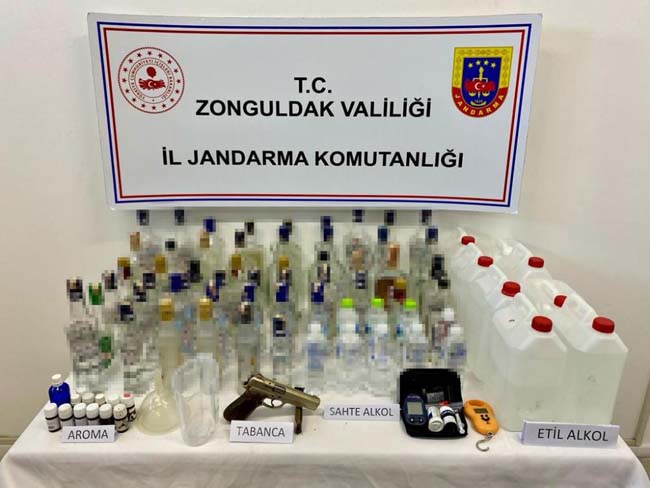 Edinilen bilgiye göre Zonguldak İl Jandarma Komutanlığı ekiplerince yılbaşı tedbirleri çerçevesinde, Alaplı ilçesinde bir şüpheliye ait ev ve eklentilerde arama yapıldı. Operasyonda 30 litre etil alkol, 12 adet muhtelif boyutlarda şişe içerisinde sahte alkol, 13 adet sahte alkol üretiminde kullanılan aroma maddesi, 68 adet muhtelif boyutlarda cam şişe, 3 adet sahte alkol üretiminde kullanılan aparat, 1 adet hassas terazi, 1 adet 9 mm çapında ruhsatsız tabanca ele geçirildi.