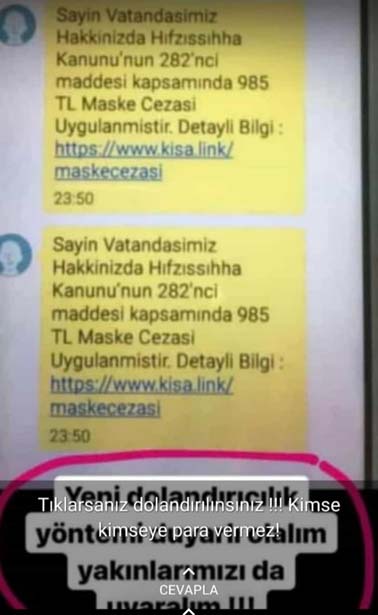 Dolandırıcılar bu sefer İçişleri Bakanlığı tarafından yakın zaman önce açıklanan “Yoğunlaştırılmış Dinamik Denetim” genelgesini hedef aldı. Kısmi kapanma sürecinde ülke genelinde sıkı tedbir ve cezaların uygulanacağının açıklanmasının hemen ardından yüz binlerce kişinin telefonuna sahte ‘maske cezası’ mesajları gönderildi. İçişleri Bakanlığı’ndan gönderilmiş gibi hazırlanan ve “Sayın Vatandaşımız Hakkınızda Hıfzıssıhha Kanunu'nun 282'nci maddesi kapsamında 985 TL maske cezası uygulanmıştır. İlgili kayıtlar ve detaylı bilgi için tıklayın” ifadelerinin yer aldığı mesaja tıklayan birçok vatandaşın ise casus yazılımlarla telefonu hacklendi. Telefona yüklenen yazılımla tüm bilgilerine ulaşılan vatandaşların 300 bin lira dolandırıldıkları öğrenildi. Kastamonu İl Emniyet Müdürlüğü ekipleri, telefon dolandırıcılarına karşı vatandaşları uyararak, bu tür mesajlara itibar edilmemesini istedi.