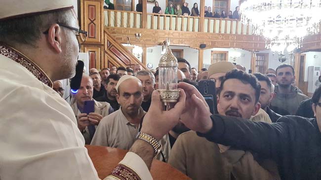Merkez Camii'nde teravih namazını kılmaya gelen Alaplılılar, camiyi doldurdu. Kılınan teravih namazının ardından Hz. Muhammed’in Sakal-ı Şerif'i ilçe halkına gösterildi. Salavatlar getiren ziyaretçiler yoğunluk oluşturdu. Cami imamı Sakal-ı Şerif'i elinde tutarken, vatandaşlar ellerini Sakal-ı Şerif'e sürerek dualar okudu. Bazı kişilerin ise Sakal-ı Şerif'in fotoğrafını çekmeye çalışması izdihama sebep oldu.
