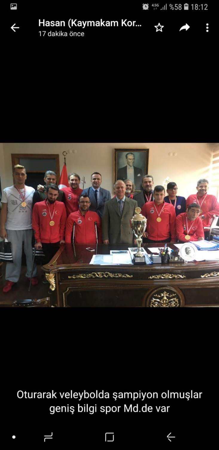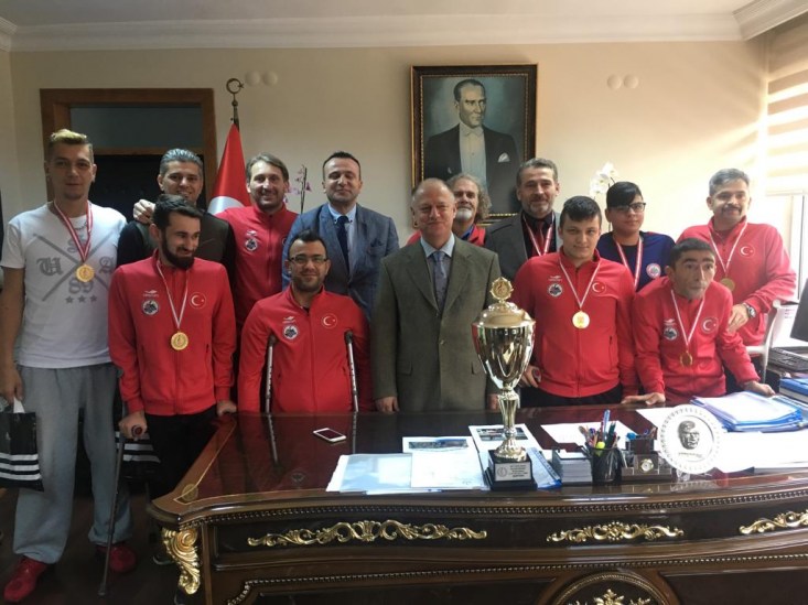 TBESF Paravolley Türkiye Kupası müsabakalarında oynadığı 4 karşılaşmayı da kazanarak Türkiye Şampiyonu olan Kdz. Ereğli Belediyespor Oturarak Voleybol Takımı, Türkiye Kupası Şampiyonluğu sebebiyle Kdz. Ereğli İlçe Gençlik ve Spor Müdürü Serkan Keleş ile birlikte Kdz. Ereğli Kaymakamı İsmail Çorumluoğlu'nu makamında ziyaret etti.