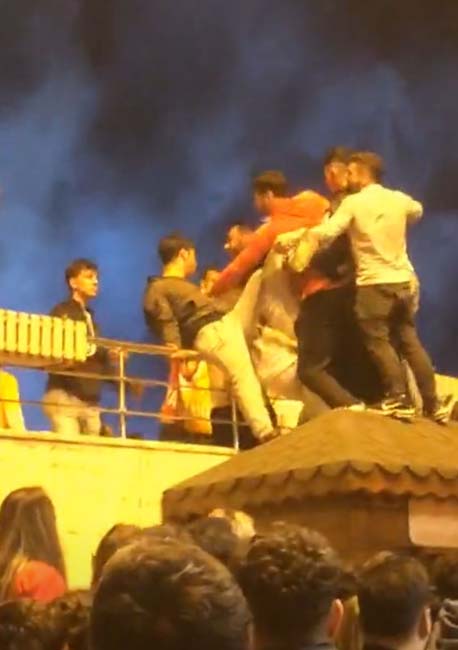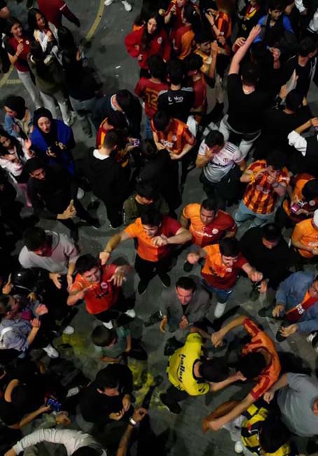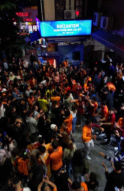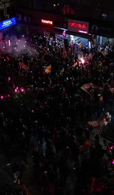 Galatasaraylı taraftarlar Fenerbahçeli taraftarları havaya fırlatarak kutlamalarına dahil ettiler