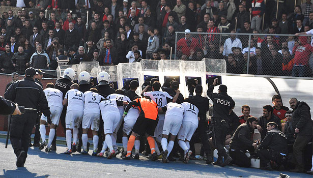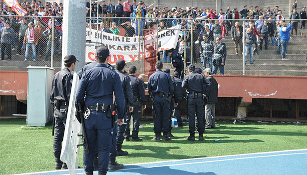 taraftarlar duruma tepki gösterdi. Polisler, kavga eden taraftarların elindeki