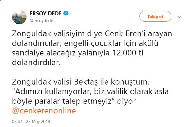 "Zonguldak valisiyim diye Cenk Eren'i arayan dolandırıcılar; engelli çocuklar için akülü sandalye alacağız yalanıyla 12.000 TL dolandırdılar. Zonguldak Valisi Erdoğan Bektaş ile konuştum. 'Adımızı kullanıyorlar, biz valilik olarak asla böyle paralar talep etmeyiz' diyor."