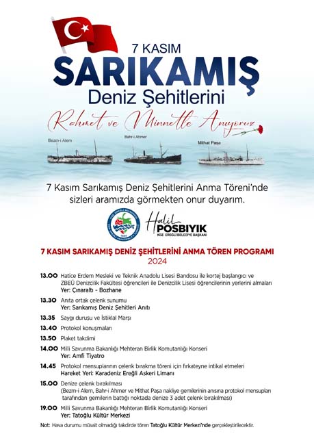 Sarıkamış'ta donarak şehit olan on binlerce askere kışlık giyecek, erzak ve mühimmat götürürken, 7 Kasım 1914'te Ereğli açıklarında Rus donanması tarafından batırılan "Bezm-i Alem", "Bahr-i Ahmer" ve "Mithat Paşa" gemilerinde şehit olan 221 mürettebat 110’uncu yılında Kdz. Ereğli’de törenlerle anılacak.