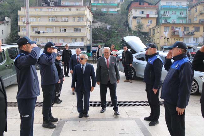 Belediye Başkanı Halil Posbıyık, Oramiral Ataç’ı belediye binası girişinde başkan yardımcılarıyla birlikte zabıta karşılama mangası eşliğinde karşıladı.