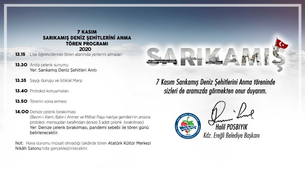 Karadeniz Ereğli Belediyesinden konuya ilişkin yapılan açıklamada 7 Kasım Sarıkamış Deniz Şehitleri Anma Günü nedeniyle tören düzenlenecek.