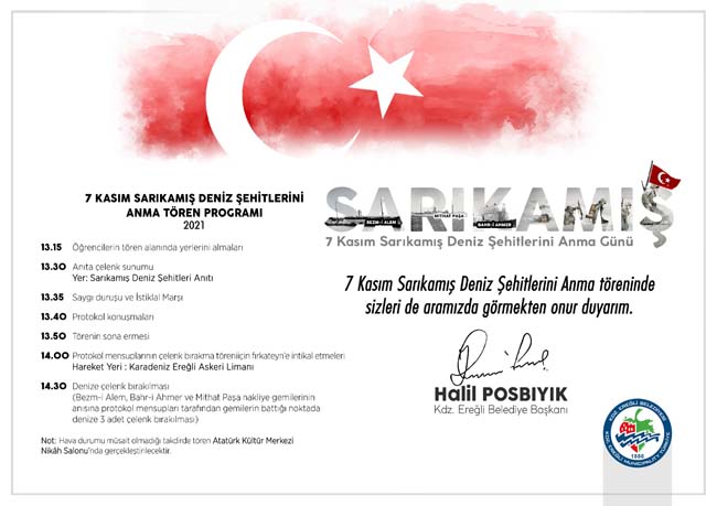 Tarihimizde büyük kahramanlıklarla beraber büyük facialar da yaşanmıştır. Birinci Dünya Savaşı'nda Sarıkamış harekatına destek malzemeleri taşırken Karadeniz Ereğli'de batırılan üç gemi Bezm-i Alem, Bahr-i Ahmer ve Mithat Paşa'yı ve orada şehit düşenleri unutmuyoruz. Sarıkamış harekatında verdiğimiz binlerce şehidimizi rahmetle anıyoruz.