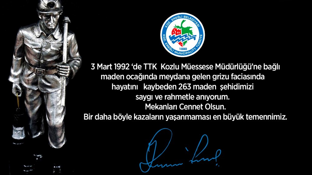 “3 Mart 1992 ‘de TTK Kozlu Müessese Müdürlüğü’ne bağlı maden ocağında meydana gelen grizu faciasında hayatını kaybeden 263 maden şehidimizi saygı ve rahmetle anıyorum. Mekanları Cennet Olsun.