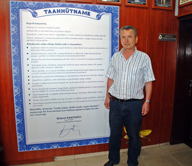Çevresinde başarılı bir belediye başkanı olarak bilinen İnşaat Yüksek Mühendisi Bülent Kantarcı, yaptığı ve belediyenin makam odası girişine astığı taahhütnameyi propaganda amaçlı olmadığını ve başkanlık süresince bu taahhütnamede yazılı olanları yerine getireceklerini söyledi. Kantarcı, "Kendi adlarına benim onlara verdiğim taahhüdün kendilerine adını yazmış bir şekilde evlerine ve ellerine teslimi kamuoyunda da ilgi gördü. Bu taahhütnameyi sadece seçim propagandası olarak değil, şimdi de başkanlık makamının girişine büyüterek bu taahhütnameyi unutmadığımızı, taahhütnamenin gereğini başkanlık süresince yerine getireceğimi kamuoyuna göstermek amacıyla büyüterek kapımızın önüne astık. Gelen vatandaşlarımızda bunları okusun bizim de sözümüzde durduğumuzu bütün herkes görsün" dedi.