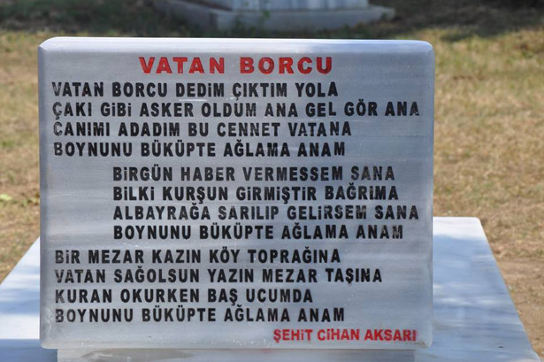 Mermerleri yaptırılan ve başucuna Türk bayrağı dikilen şehidin kabir taşına da askerdeyken annesine yazdığı duygusal şiir yazıldı. Şiiri görenler ise duygularını gizleyemediler. Kabir taşında yer alan şiir şu şekilde: