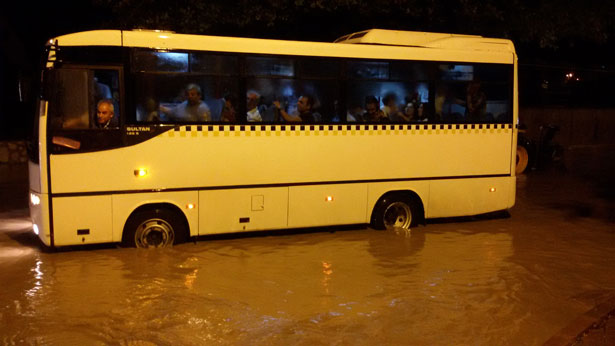 Zonguldak'ta akşam saatlerinde başlayan şiddetli yağmur sele sebep oldu. Şehir merkezinde caddeler göle dönerken yollar çöktü. Sel suları içinde yolcularıyla mahsur kalan bir otobüs kurtarıldı.