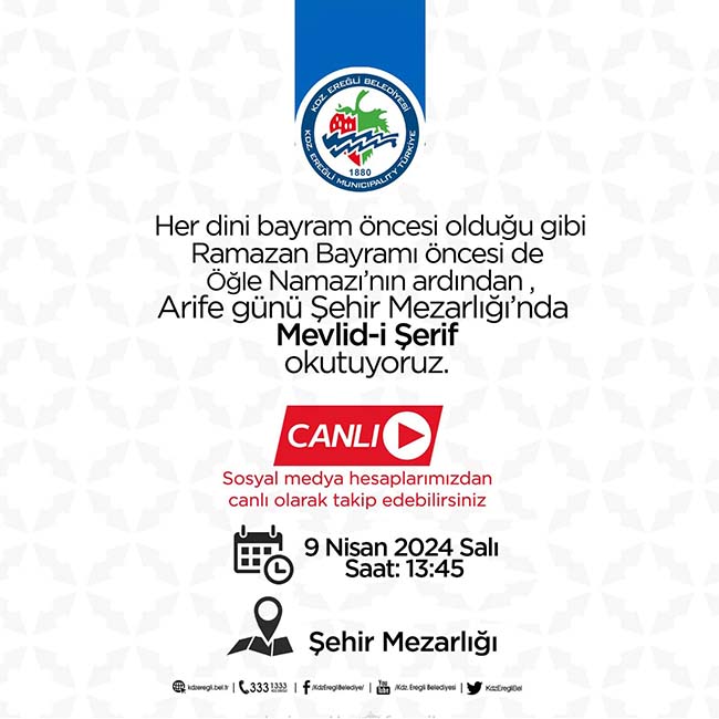 Kdz. Ereğli Belediyesi, arife günü şehir mezarlığında mevlid-i şerif programı düzenleyecek. Başkan Halil Posbıyık, mevlid programına halkı davet etti.