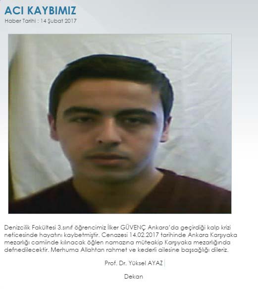 Hiçbir sağlık problemi olmayan İlker Güvenç, geçtiğimiz gece göğüs ağrısı şikayetiyle hastaneye Acil serviste tahliller yapıldı. Problem görmeyen doktorlar Güvenç'i taburcu etti. Ancak ağrılar kesilmedi. Uzman Çavuş olan babası Ahmet Güvenç, oğlunu tekrar hastaneye götürdü. Gencin elektrokardiyografisi (EKG) çekildi, kan tahlili yapıldı. Yine anormallik tespit edilmedi. Evine giden İlker Güvenç, bir süre sonra odasında yığılıp kaldı. Ambulans çağrıldı, hastaneye kaldırıldı. Ancak doktorların bir buçuk saatlik çabaları İlker'i hayatta tutmaya yetmedi.