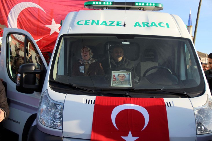 Türk bayrağı eşliğinde cenaze aracına konuldu. Şehit askerin anne ve babası