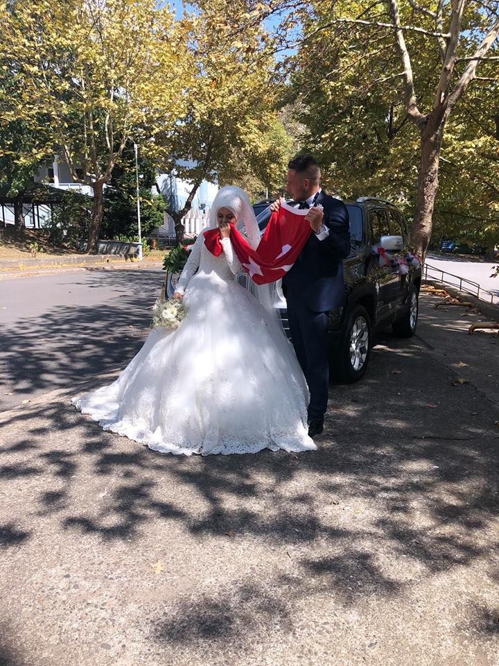 gelin arabasının üzerine çiçeklerden yapılmış Türk Bayrağı yerleştirilirken,