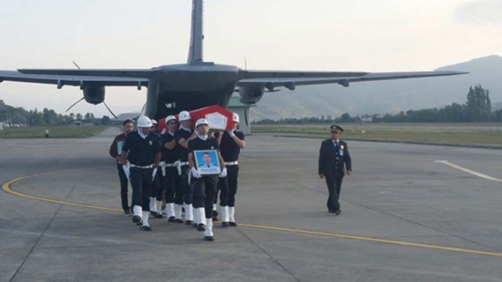 Mardin'in Nusaybin ilçesinde zırhlı aracın geçişi sırasında teröristlerin düzenlediği saldırıda şehit düşen 3 polisten Çağdaş Arslan'ın cenazesi askeri uçakla Zonguldak'ın Çaycuma ilçesindeki havaalanına getirildi.