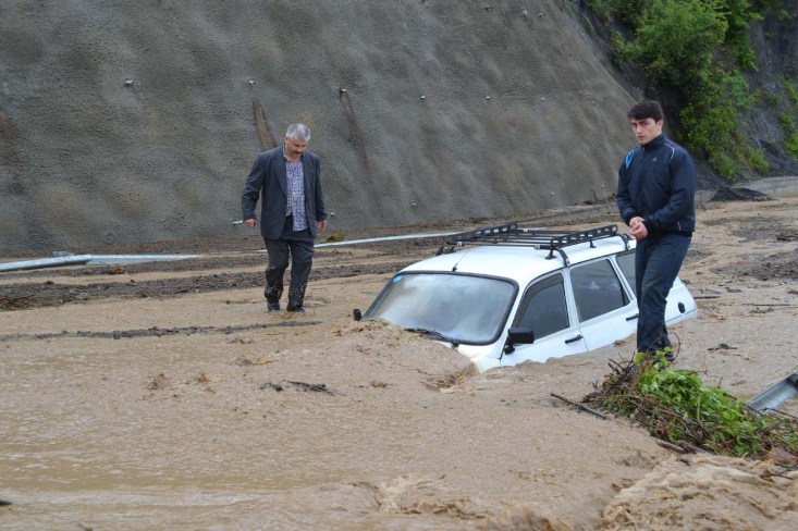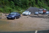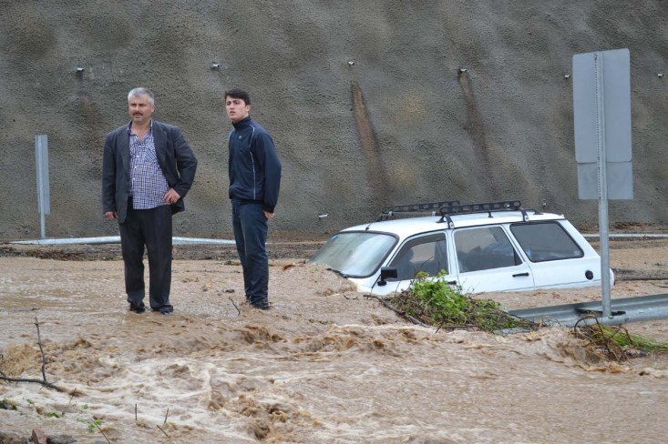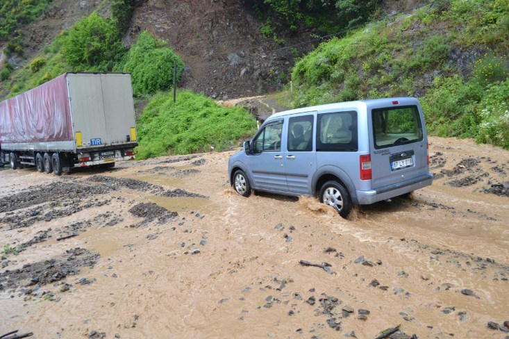 bölünmüş yolda trafik iki şeritten sağlanıyor. Sel nedeniyle duble yolda uzun