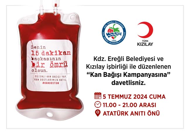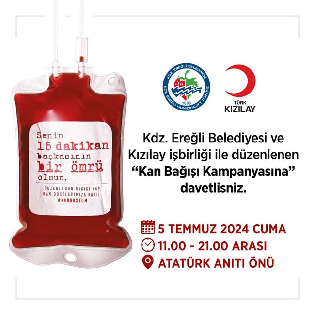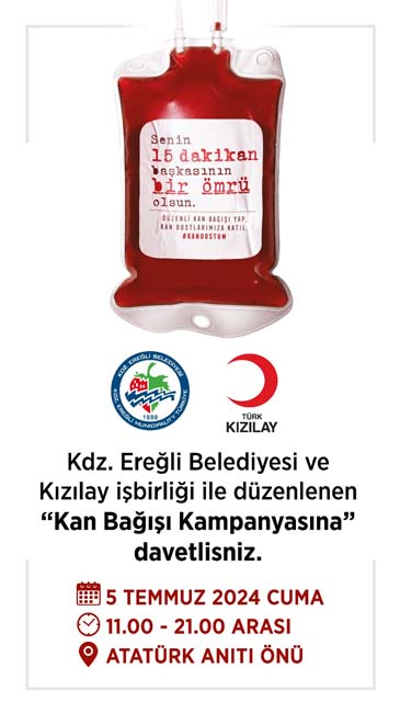 5 Temmuz Cuma saat 11.00 ile 21.00 arasında Atatürk Anıtı önünde Kdz. Ereğli Belediyesi ve Kızılay işbirliği kapsamında düzenlenecek olan Kan Bağışı kampanyasına tüm halkımız davetlidir.”