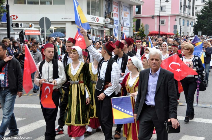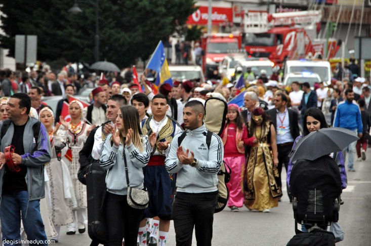 Yağmura rağmen Bosna Hersek ve Kıbrıs Halk Oyunları ekipleri Amfi Tiyatro önünde gösteri yaptı. Yağmurun hızını arttırmasıyla birlikte ara verildi.