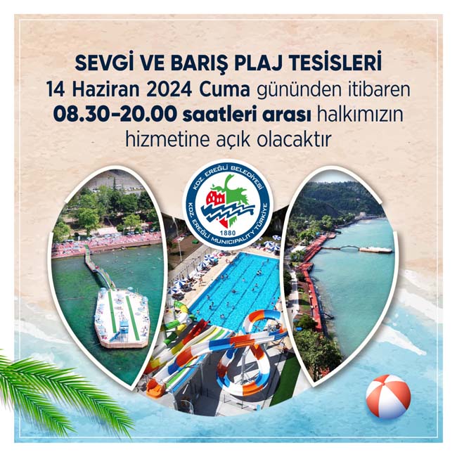 Batı Karadeniz bölgesinin mavi bayraklı tek plajları olan Kdz. Ereğli Belediyesi Sevgi ve Barış Plajı, 14 Haziran Cuma günü saat 08.30’dan itibaren halkın kullanımına açılıyor. Plajlar akşam 20.00’de kapanacak.