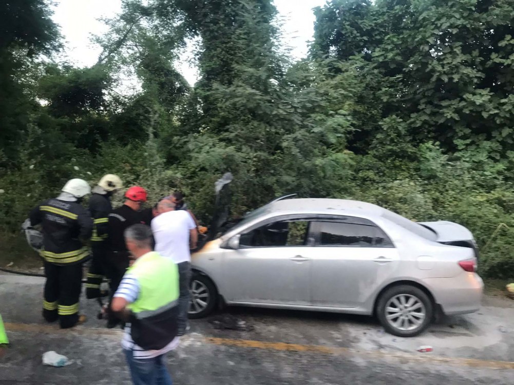 Düzce’de seyir halinde iken alev alan otomobildeki sürücü ve yolcuları son anda kendilerini araçtan dışarıya attı.