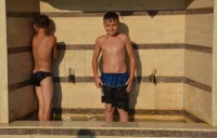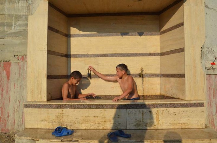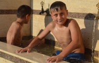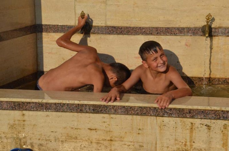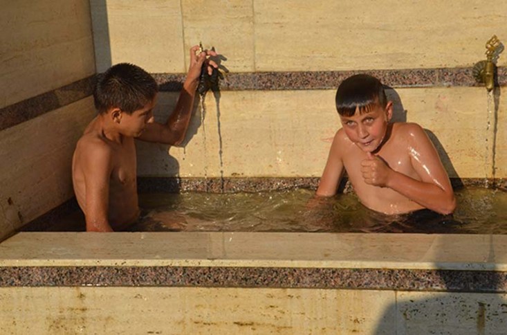 yaşındaki iki çocuk, çeşmenin yalağını suyla doldurarak serinlemeye çalıştı.