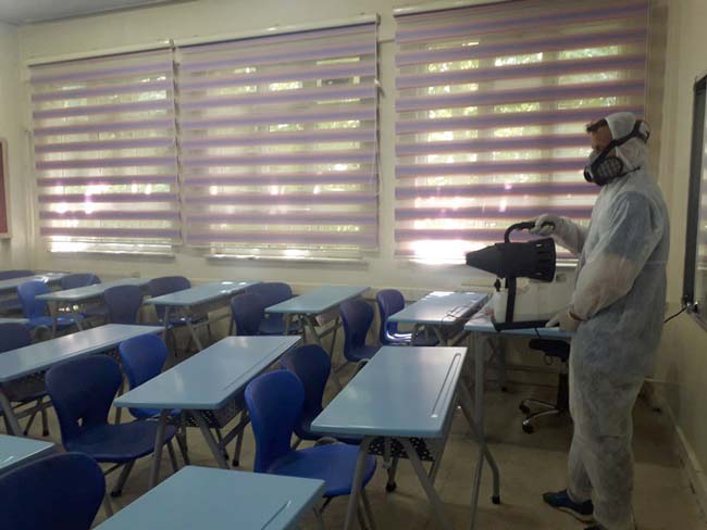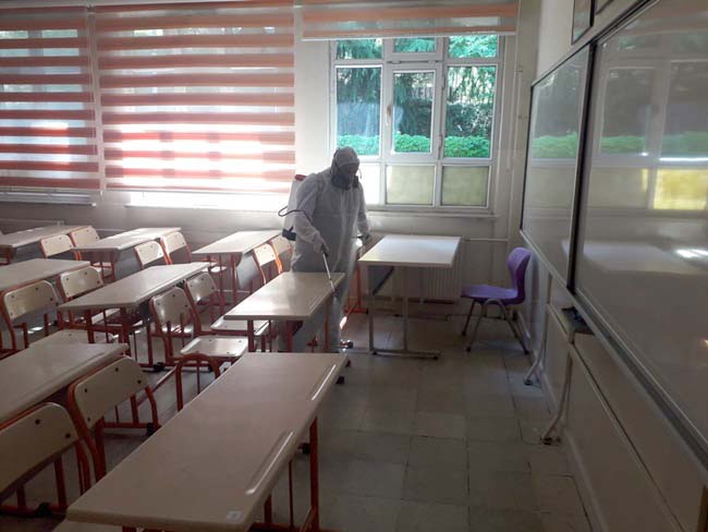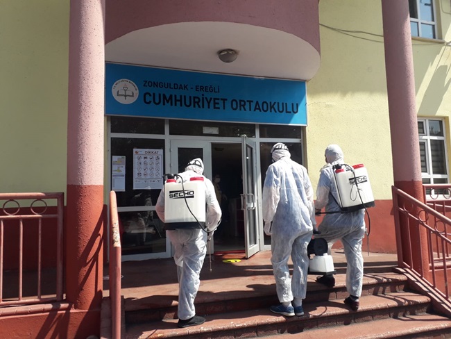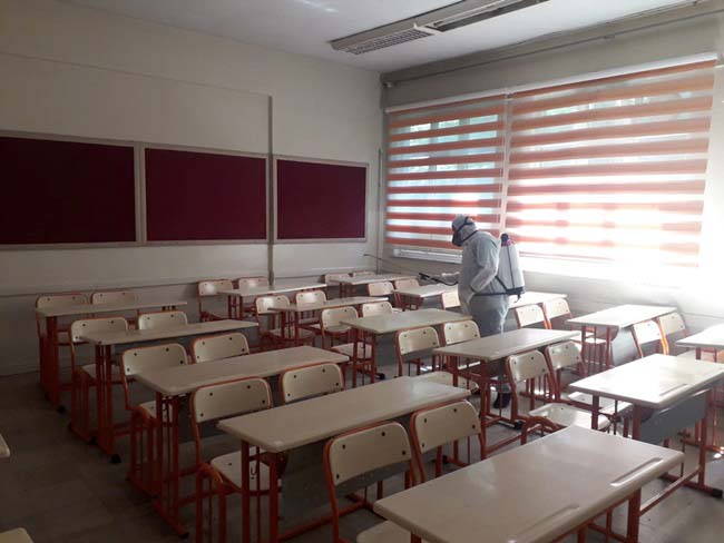 Veteriner İşleri Müdürlüğü Vektör Kontrol ve İlaçlama merkezinde görevli 2 ayrı ekip, binlerce öğrencinin üniversiteye geçiş sınavı olan Yükseköğretim Kurumları Sınavı (YKS) öncesi Ereğli genelinde sınav olacakları 18 ayrı okulu dezenfekte ediyor. Sıralar, sınıflar, öğrencilerin ve görevlilerin bulunabileceği tüm alanlar koronavirüse karşı dezenfekte ediliyor.