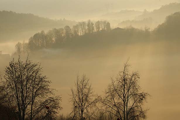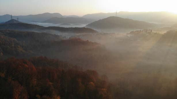 Sonbahar mevsiminin sona ermesine sayılı günler kala Zonguldak'ta sabahın erken saatlerinde oluşan manzaralar izleyenleri adeta büyüledi. Havaların soğumasıyla birlikte yanan sobaların dumanlarıyla birlikte oluşan sis ve puslu manzaraya güneşin doğuşu da eklendi. O anlar ise drone ile havadan görüntülendi.