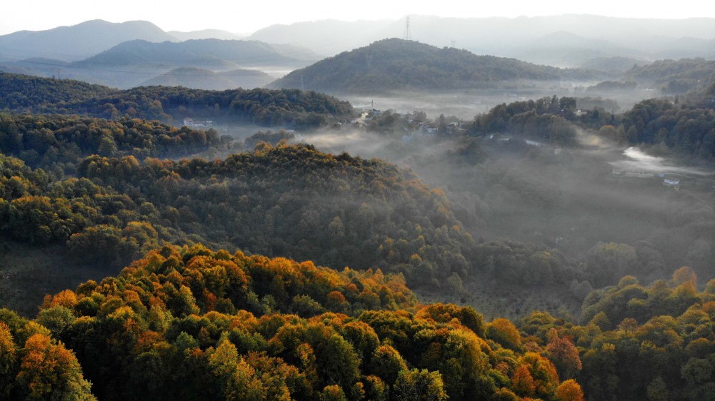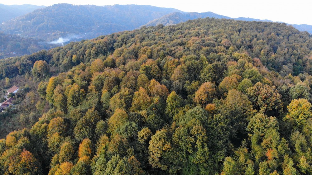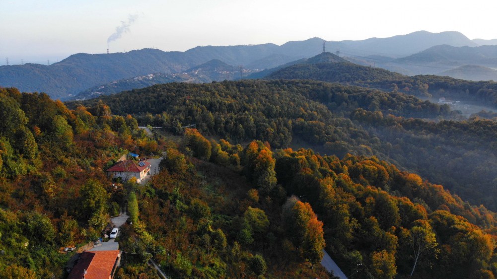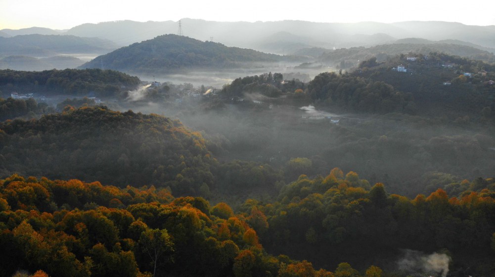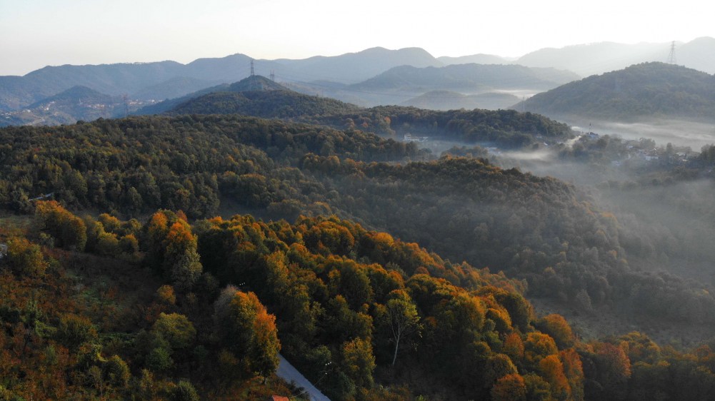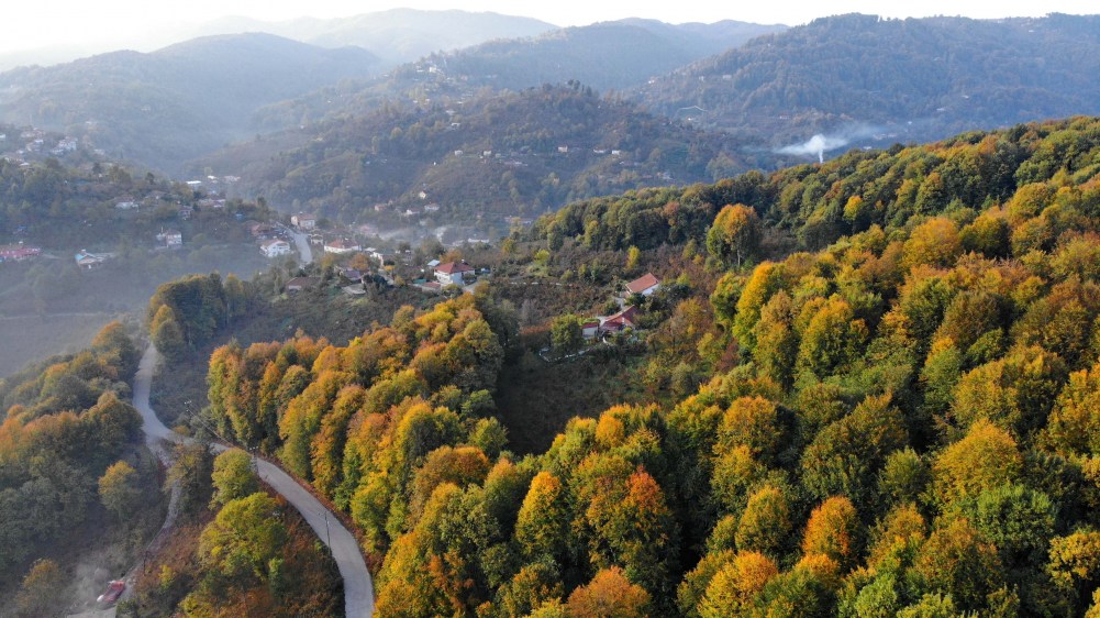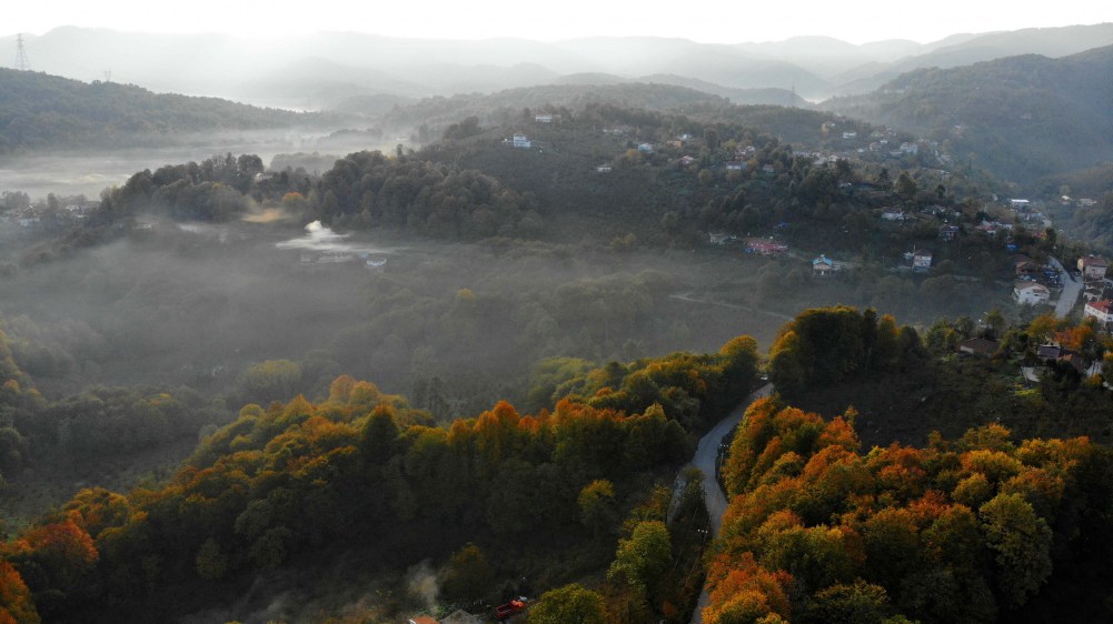 Zonguldak'ta sonbahar manzaralarına güneşin doğuşu da eklendi. Güz rengini alan ağaçlar sis ve güneşle birlikte kartpostallık manzaralara eşlik etti. Sabahın erken saatlerinde oluşan manzara drone ile havadan görüntülendi.