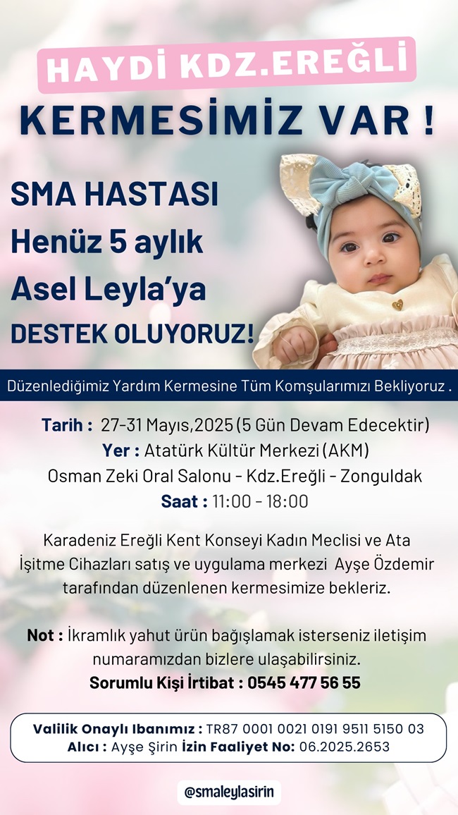 Zonguldak’ın Ereğli ilçesinde SMA hastası 5 aylık Asel Leyla’ya destek amacıyla Atatürk Kültür Merkezinde kermes düzenlendi Atatürk Kültür Merkezinde/AKM) düzenlenen kermese katılım oldukça yüksek oldu.